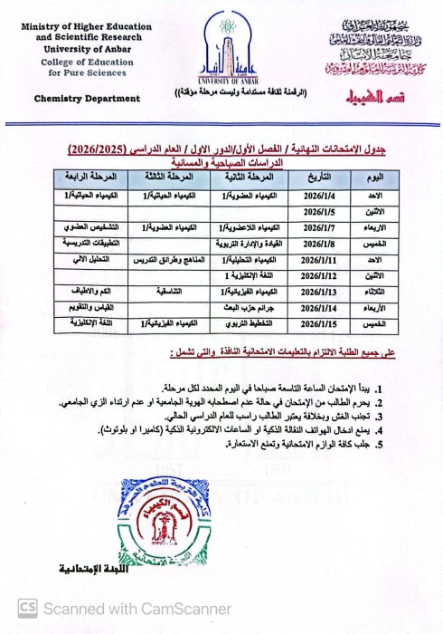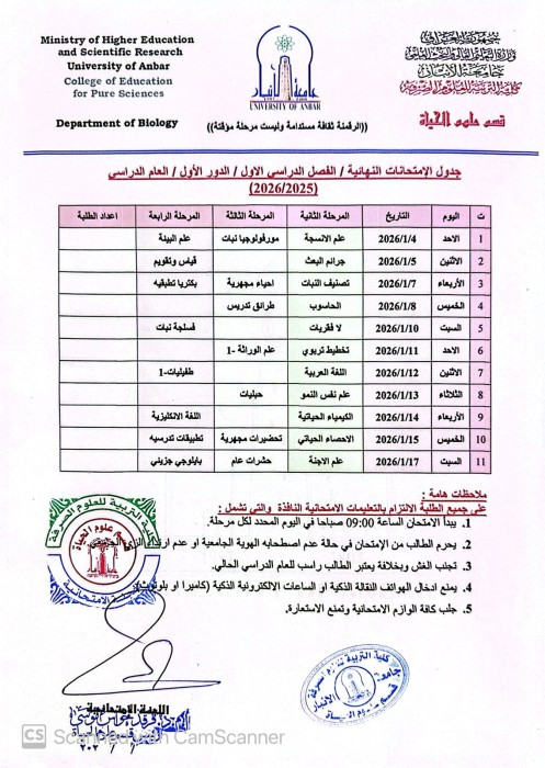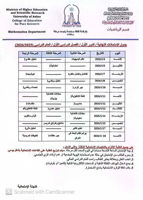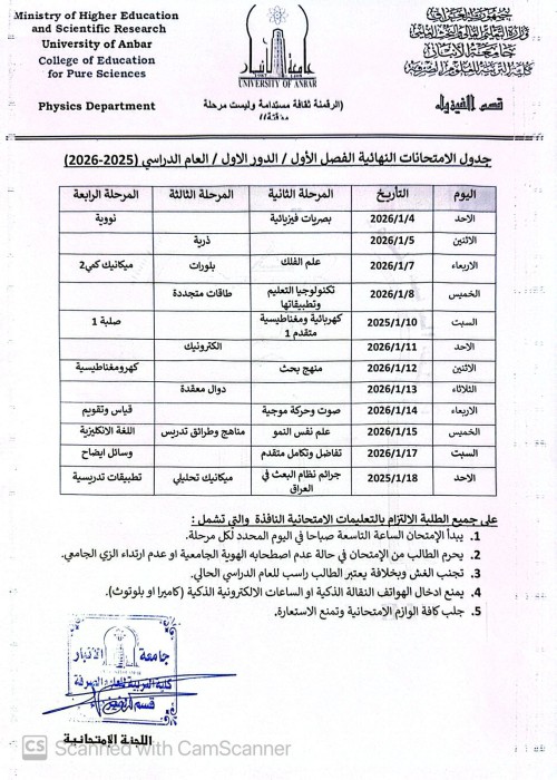 تعلن كلية التربية للعلوم الصرفة عن جداول الأمتحانات النهائية للدراسات الأوليـة (الصباحية والمسائية) الفصـل الدراسي الأول- الدورالأول للعام الدراسي (2025-2026) ولجميع الأقسام العلمية في الكلية وكما مبين في أدنــاه... متمنين لجميع طلبتنا الأعـزاء النجاح والتوفــيق......